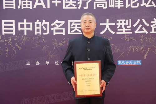 2018年9月16日上午,由四川省卫计委指导监督,封面新闻、华西都市报、家庭与生活报联合主办的四川省首届AI+医疗高峰论坛暨第六届“榜样中国·我心中的名医”大型公益评选活动的颁奖仪式在四川日报报业集团隆重举行。大会现场,我院喻明江主任荣膺“皮肤科十大名医”称号。